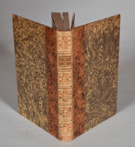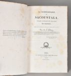 CALIDASA. LA RECONNAISSANCE DE SACOUNTALA. Drame sanscrit et pracrit. Traduit sur un manuscrit unique de la bibliothèque du Roi par A. L. Chézy. PARIS, DE DONDEY - DUPRÉ, 1832. Un volume, in-8, de 415 pp., demi-reliure de l'époque en basane mouchetée. Dos à 5 nerfs cloisonné, fleuronné et doré portant le titre doré. Quelques rousseurs claires éparse sinon bon exemplaire. Ouvrage rare.