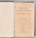 DUBOIS J. A. MOEURS INSTITUTIONS ET CÉRÉMONIES DES PEUPLES DE L'INDE. PONDICHÉRY, IMPRIMERIE DE LA MISSION CATHOLIQUE, 1899. Deux tomes réunis en un volume de (6) ff., XVII pp., 398 pp. - 460 pp., 8 pp., demi-reliure à coins en basane sombre. Dos à 4 nerfs portant le titre doré. Dos uniformément éclairci, cachets ex-libris, léger frottement sur la coiffe inférieure. Nouvelle édition, en partie originale, car enrichie d'une préface et de notes.