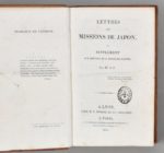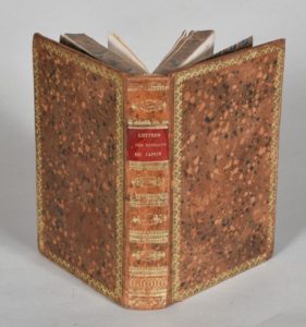 [FAIVRE François.] LETTRES DES MISSIONS DU JAPON, ou supplément aux lettres de S. François Xavier ; par Mr. A. F. LYON - PARIS, RUSAND & Cie, 1830. Un volume, in-8, de XXII pp., 560 pp., peine reliure de l'époque en basane mouchetée. Dos lisse orné et doré portant une pièce de titre en maroquin rouge, dentelle dorée autour des plats, tranches jaspées. Quelques rousseurs claires éparses. La majorité de ces lettres est adressée à la Compagnie de Jésus, certaines concernent une correspondance entre les jésuites eux - même. Elles ont été écrites du Japon depuis Bungo (aujourd'hui prefecture d'Oita), Funai (Oita), Firando (près Nagasaki), Sacai (pès d'Osaka), Méaco (Kyoto), Vocoxiura (Yokose), Saxuma (Satsuma), Cangoxima (Kagoshima), Amanguchi (Yamaguchi), Facunda (près Nagasaki), et quelques autres de Goa, Malacca ou Canton.
