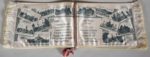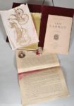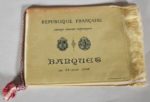 [GASTRONOMIE]. MENU SUR SOIE. BANQUET DU 24 JUIN 1894. BANQUET OFFERT À MONSIEUR LE PRÉSIDENT DE LA RÉPUBLIQUE par le Conseil Municipal de Lyon & le Conseil Général du Rhône. LYON, Imprimerie ARNAUD. Menu imprimé sur soie. Quatre pages, sur deux pièces de soie, in-8 oblong (80 cm / 30 cm) réunies par un cordon de fils tressés, bleu, blanc, rouge. Conservé dans un double emboîtage cartonné et titré. Bel état malgré quelques frottements sur les deux parties de l'emboîtage et de petites traces sur la bordure supérieure du premier plat du menu. Ce menu est accompagné, sur une feuille imprimée, du discours prononcé à cette occasion par le Président Carnot. Mais aussi enrichi d'une photographie du landau dans lequel le président Carnot fut assassiné (petits manques en bordure). D'un fascicule broché de 32 pages présentant Sadi Carnot en 1888.