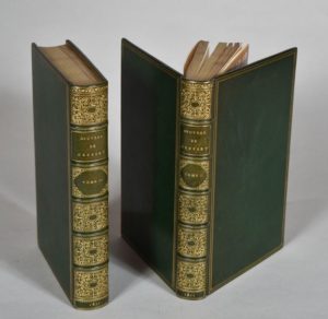 GRESSET. OEUVRES. PARIS, RENOUARD, 1811. Deux volumes, in-8, de LXXII pp., 383 pp. - (2) ff., VIII pp., 444 pp., (2) ff., 120 pp., pleines reliures de l'époque en maroquin vert. Dos à 5 nerfs très ornés et dorés portant les titres dorés, triple encadrement de filets dorés sur les plats, filets dorés sur les coupes, dentelle intérieure dorée, tranches dorées. Rousseurs sur les gravures et les feuillets proches. Un portrait frontispice de l'auteur et 8 figures hors texte par Moreau dont 7 gravées par Simonet et 1 par de Gendht. Édition la plus complète.
