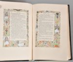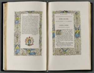 Titre frontispice enluminé à la main sur papier fort, dix gravures sur acier de Tony Johannot et Cavelier, également sur papier fort, toutes les pages avec encadrements gothiques. Cet encadrement, sur toutes les pages, a été aquarellé de couleurs différentes à chaque page de façon très précise, minutieuse et très harmonieuse.