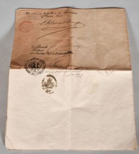 LAFORGUE Jean. PASSEPORT. Délivré par le Chargé d'Affaires de France en Saxe pour Jean Laforgue accompagné de son épouse Marie - Anne se rendant en Suisse, en France, en Bavière et retournant à Dresde. Le présent passeport délivré sur connaissance personnelle par le Chargé d'Affaires de France E. de Barante. DRESDE, LE 23 JUIN 1845. Une large feuille de 55 x 43 cm, en partie imprimée et manuscrite, plusieurs fois pliée avec cachets et signatures. Au verso figurent les différents contrôles aux passages des frontières. Quelques déchirures aux pliures. Très lisible et sans manque. Jean Laforgue (1782 - 1852), reste comme arrangeur de la première édition des "Mémoires de Casanova".