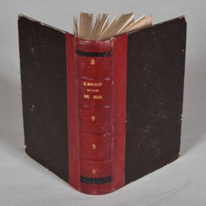 MOUHOT Henri. VOYAGE DANS LES ROYAUMES DE SIAM DE CAMBODGE, DE LAOS, et autres parties centrales de l'Indo-Chine. Relation extraite du journal et de la correspondance de l'auteur par Ferdinand de Lanoye. PARIS, HACHETTE & Cie, 1868. Un volume, petit in-8, demi-reliure de l'époque en chagrin rouge. Dos à 4 faux nerf décoré et doré portant le titre doré. Coins émoussés, quelques piqûres éparses. Portrait en frontispice, une carte dépliante, et 28 gravures.