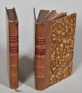 [REINAUD Joseph Toussaint]. RELATION DES VOYAGES faits par les Arabes et les Persans dans le IXe siècle de l'ère chrétienne. Texte arabe imprimé en 1811 par les soins de feu Langlès. Publié avec des corrections et additions et accompagné d'une traduction française et d'éclaircissements par M. Reinaud. PARIS, IMPRIMERIE ROYALE, 1845. Deux volumes, in-12, de (3) ff., CLXXX pp.,154 pp. - 105 pp., (99) ff. (écriture arabe), demi-reliures de l'époque en chagrin fauve. Dos à 5 nerfs portant les pièces de titre et de tomaison en basane rouge, tranches peignées. Cachets de bibliothèque. Ouvrage peu courant, de Abu Zayd d'Hasan ibn YazïdSïräfi.