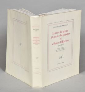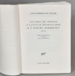 CÉLINE Louis Ferdinand. LETTRES DE PRISON A LUCETTE DESTOUCHES ET MAÎTRE MIKKELSEN 1945 - 1947. PARIS, N. R. F., GALLIMARD. Un volume, in-8, broché, couverture rempliée, feuilles non coupées. Édition originale, un des 111 exemplaires numérotés sur chiffon de Lana, seul grand papier. Celui-ci n° 63.