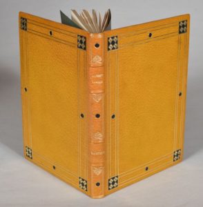 SAMAIN Albert - MOSSA. XANTHIS, ou la vitrine sentimentale. PARIS, FERROUD, 1920. Un volume, grand in-8, pleine reliure en maroquin citron. Dos à 4 nerfs décoré de motifs dorés, de trois points noirs mosaïqués et portant le titre doré. Décor géométrique doré sur les plats accompagné de points noirs et de carrés noirs mosaïqués en écoinçons. Filet doré sur les coupes, tête dorée, dentelle dorée intérieure, couverture et dos conservés. Illustrations en couleurs de Gustave Adolphe Mossa.