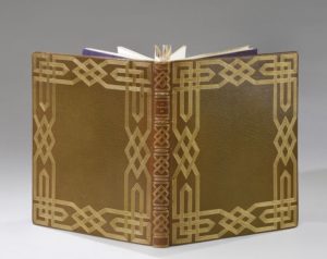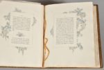 THEURIET André. FLEURS DE CYCLAMENS. PARIS, DUREL, s. d. (vers 1900). Un volume, in-4, pleine reliure en maroquin havane. Dos à 5 nerfs décoré et doré portant le titre doré, large décor doré géométrique entrelacé autour des plat, filets doré sur les coupes, non rogné, tête dorée. Contre - plats doublés de maroquin violet et bordés d'une large guirlande florale en vert rouge et or dans un encadrement de filets et roulette dorés, gardes doublées de tissu moiré violet. Illustrations en couleurs de Ch. Coppier.