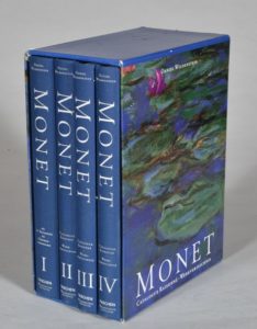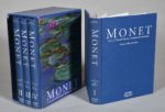WILDENSTEIN Daniel - Claude MONET. CATALOGUE RAISONNÉ. Ou le triomphe de l'Impressionnisme. TASCHEN - WILDENSTEIN INSTITUTE, 1996. Quatre volumes, in-4, reliures éditeur à la bradel habillés de toile bleu nuit. Quatre volumes rassemblés dans un étui éditeur illustré en couleurs (légers frottement). Sans le tome V de supplément, souvent absent.