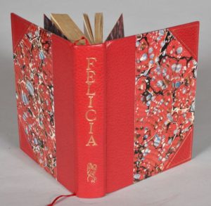 ANDRÉA DE NERCIAT. FÉLICIA ou mes fredaines. Roman. PARIS, DEUX RIVES, 1952. Un volume, in-8, demi-reliure à coins en peau maroquinée rouge. Dos lisse décoré d'une palette dorée et portant le titre doré à la chinoise, filet doré soulignant les coins, tête dorée, couverture conservée. Compositions en couleurs libres de William Fel.