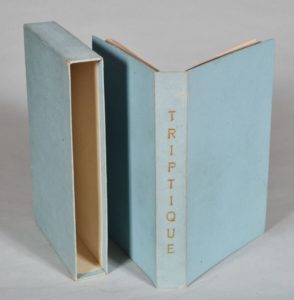 [ANONYME]. TRIPTIQUE. Le bon vieux temps - Quatrains - Proverbes. s. l., s. n., s. d. [PARIS, VIALET, VERS 1945]. Trois fascicules, in-8, d'environ 22 ff. chacun, sous couvertures rempliées, illustrées en couleurs, rassemblés dans le double emboîtage de l'éditeur. Bon exemplaire. Dix planches libres, en couleurs, par fascicule. Soit 30 belles illustrations (et les 3 illustrations de titre) en couleurs pour l'ensemble et d'inspiration érotique.
