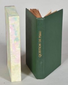 [ANONYME]. QUESTION DE PEAU. s. l., s. n., s. d. Un volume in-12, pleine reliure en peau chagrinée verte. Dos lisse portant le titre doré en long, Étui bordure peau. Sans le titre et les douze premières pages de ce texte fortement érotique.