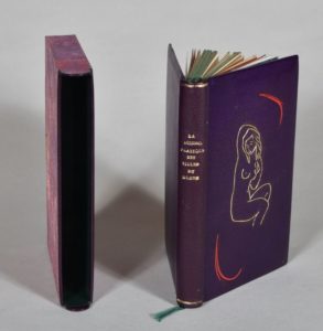 [ANONYME]. LA SCIENCE PRATIQUE DES FILLES DU MONDE. COLOGNE, CHEZ PIERRE MARTEAU, 1790. Deux tomes réunis en un volume, in-8, pleine reliure en peau chagrinée sombre. Dos lisse portant le titre doré, dessin érotique personnalisé, au trait, doré sur le premier plat, tête verte, couverture conservée, étui bordure peau. Illustré de six gravures libres en couleurs.