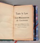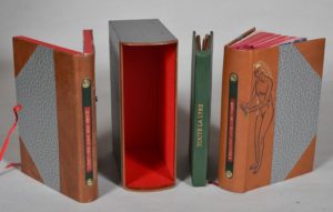 [ANONYME]. L'ÉDUCATION D'UNE DEMI - VIERGE par l'auteur de la Passion de Gilberte. PARIS, BRUXELLES, 1903. Deux volumes, in-8, demi-reliures à coins en basane havane. Dos lisses décorés portant des pièces de titre en maroquin rouge sur fond vert, titre doré en long. Décors personnalisés, érotiques, au trait, sur les premiers plats, tête rouge pour le premier. Le tome II, sauvé de la destruction, en partie dérelié est contenu dans une chemise à la bradel en pleine peau chagrinée verte et une boîte. L'ensemble rassemblé dans un boîtier bordure peau. Bel exemplaire et important travail de reliure. Texte érotique rare.