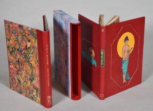 APOLLINAIRE Guillaume. POÉSIES LIBRES. Cortège priapique - Julie ou la rose - Le verger des amours. EN SOUVENIR D'ISIDORE LISEUX - Paris vers 1950. Un volume, petit in-4, pleine reliure en chagrin rouge. Dos lisse portant une pièce de chagrin vert pour le titre doré, tête dorée, couverture conservée. Premier plat illustré d'un motif personnalisé, mosaïqué en plusieurs couleurs dans l'encadrement d'un filet doré. Le second plat est illustré d'un motif érotique mosaïqué en plusieurs couleurs dans un encadrement doré. Chemise à rabats au dos en chagrin rouge titrée en long, étui bordure peau. Quatre illustrations libres en noir par Suzanne Balivet.