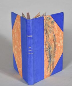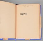 [ARAGON Louis]. IRÈNE (LE CON D'IRÈNE). s. l., s. n., s. d. Un volume, in-8, demi-reliure à coins habillée de basane bleu ciel. Dos lisse portant le titre doré, premier plat illustré d'un motif personnalisé érotique, non rogné, tête jaspée de plusieurs couleurs. Édition clandestine. La première par J. J. Pauvet fut publiée en 1952.