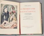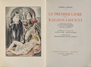 ARÉTIN Pierre. LE PREMIER LIVRE DES RAGIONAMENTI. La vie des Nonnes. La vie des femmes mariées. La vie des courtisanes. Sonnets luxurieux. Introduction et notes par Guillaume Apollinaire. PARIS, BRIFFAUT, 1935. Un volume, in-8, demi-reliure à coins en chagrin bronze. Dos lisse portant le titre doré à la chinoise, titre doré sur le premier plat, tête dorée, couverture conservée. Illustrations libres en couleurs de Berthommé Saint André.