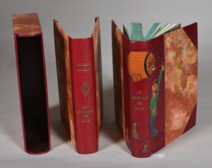 ARNAC Marcel. LE BRELAN DE JOIE. PARIS, ATHENA, 1946. Un volume, in-8, demi-reliure à coins en maroquin rouge foncé. Dos lisse portant le titre et un décor personnalisé, mosaïqué, se poursuivant sur les plats, couverture conservée, tranches vertes guillochées de fers dorés. Chemise à rabats portant le titre et étui bordures peau. 10 hors - texte et 39 in-textes, culs - de - lampe et lettrines d'après les originaux de l'auteur.
