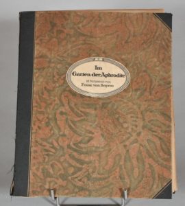 [BAYROS Franz von] alias CHOISY LE CONIN. IM GARTEN DER APHRODITE. s. l., s. n., s. d. (vers 1900) Un volume, petit in-folio, de titre et 18 planches, chemise éditeur. Dos et coins habillés de percaline sombre. Petite usure sur le dos, rabat inférieur détaché. Premier et unique tirage limité à 350 exemplaires. Celui-ci n° 48.