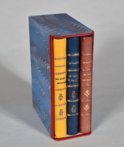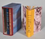 BESANÇON Docteur Julien. LES JOURS DE L'HOMME - LE VISAGE DE LA FEMME - NE PAS DÉTELER. PARIS, AUX ÉDITIONS TERRES LATINES, 1940. Trois volumes, in-8, demi-reliures en basane jaune pour le premier, bronze pour le deuxième, violet pour le troisième (dos, pour ce dernier, légèrement et uniformément éclairci), couvertures et dos conservés. Les trois volumes sont réunis dans un étui bordures peau. Trois volumes illustrés de figures érotiques, en couleurs, de Jean Dratz.