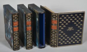 BOCCACE. CONTES. PARIS, LE VASSEUR & Cie, 1935. Trois volumes, grand in-8, pleines reliures en maroquin bleu nuit. Dos à 5 nerfs orné d'un monogramme doré et portant deux pièces de titre en maroquin rouge. Plats supérieurs recouverts d'un semé doré de deux B entrelacés, motif repris en plus grand au centre des deux plats, têtes dorées, couvertures et dos conservés, étuis bordure peau. Quelques épidermures sur les dos. Édition ornée de 56 compositions érotiques en couleurs par Mariette Lydis.