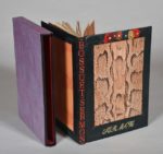 BOSSUET Jacques Bénigne. SERMON POUR LA PROFESSION DE Mme DE LA VALLIÈRE. Duchesse de Vaujour. Paris : En l'imprimerie Royale, 1676 [vers 1930]. Un volume, grand in-8, pleine reliure en veau noir. Dos lisse portant le titre calligraphié en rouge ; encadrement avec fleurs mosaïquées en plusieurs couleurs sur le haut du premier plat recouvert d'un papier façon reptile, second plat habillé d'un papier évoquant celui du premier plat en jaune et rouge, couverture conservée, tête dorée, non rogné. Étui bordures peau. Illustré de 10 planches en couleurs très libres.