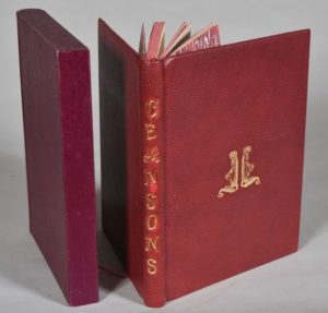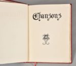 CHANSONS. PAILLARDES. s. l., s. n., s. d. (1940). Un volume, in-8, pleine reliure en peau chagrinée rouge sombre. Dos lisse portant le titre doré à la chinoise, tête rouge, couverture conservée, le premier plat est orné d'une illustration dorée reprenant celle de la couverture : deux hippocampes se tournant le dos, tête rouge, étui bordures peau. Vingt illustrations libres non signées.