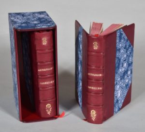 [COLLECTF]. ANTHOLOGIE DES PAGES LIBERTINES. LE XVIII SIÈCLE - ANTHOLOGIE DES PAGES MAGNIFIQUES. TOUS LES SIÈCLES TOUS LES PAYS. PARIS, NILSSON, s. d. (vers 1900). Deux volumes, demi-reliures à coins en basane bordeaux. Dos à nerfs décorés et portant les titres dorés, têtes rouges, couvertures et dos conservés. Réunis dans un étui bordure peau. Ouvrages peux courants, ici réunis.