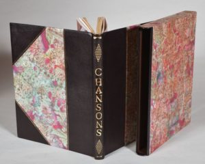 [COLLECTIF]. CHANSONS DE SALLE DE GARDE. INTERNAT, ENSEIGNE DES TROIS ORFÈVRES, QUARTIER LATIN. Un volume, grand in-8, demi-reliure à coins en chagrin marron. Dos lisse décoré et doré portant le titre doré à la chinoise, filet doré sur les plats, tête dorée, couverture et dos conservés. Étui bordure peau. Quarante chansons illustrées par quarante compositions hors texte érotiques et de nombreuses illustrations dans le texte.