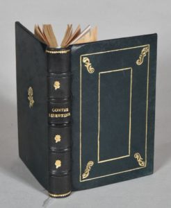 CONTES LIBERTINS. PAR GRÉCOURT NOGARET VERGIER PIRON etc. s. l., s. n., s. d. Un volume, in-16, pleine reliure en basane bronze. Dos à 5 nerfs décoré et doré portant le titre doré, double encadrement en filet doré sur le premier plat avec palettes dorées en écoinçon, palette dorée (fleur) au centre du second plat, tête dorée, couverture conservée. Illustré de 8 gravures libres en couleurs, non signées.