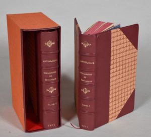 COURTEPAILLE (pseud. de Edmond DARDENNE - BERNARD). ANTHOLOGIE HOSPITALIÈRE ET LATINESQUE. Recueil de chansons de salle de garde, anciennes et nouvelles, entre - lardées de chansons du quartier latin, fables, sonnets, charades, élucubrations diverses, etc. Réunies par Courtepaille. PARIS, CHEZ BICHAT - PORTE - A - DROITE, 1911- 1913. Deux volumes, in-8, demi-reliures à coins en chagrin marron. Dos à 5 nerfs décorés et dorés portant les titres dorés (quelques dorures effacées), têtes rouges, non rognés, couvertures et dos conservés. Deux volumes rassemblés dans un étui, bordures peau. Il a été tiré un nombre limité d'exemplaires. Celui - ci sur papier vergé après les 50 sur papier Hollande.