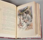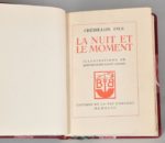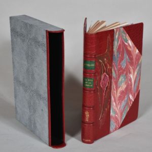 CRÉBILLON FILS. LA NUIT ET LE MOMENT. Ou les Matines de Cythère. PARIS, ÉDITIONS DE LA NEF D'ARGENT, 1943. Un volume, in-8, demi-reliure à coins en chagrin rouge foncé. Dos à 5 nerfs décoré et doré portant deux pièces de titre en maroquin vert, tête dorée, couverture et dos conservé, étui bordures peau. Illustrations libres en couleurs de Berthommé Saint - André.