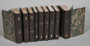 D'ICY Jacques - BOB SLAVY - SADIE BLACKEYES - RENÉ - MICHEL DESERGY - JEAN CLAQUERET. COLLECTION DES ORTIES BLANCHES. PARIS, COLLECTION DES ORTIES BLANCHES - JEAN FORT, s. d. (vers les années 1922). Neuf volumes, in-8, demi-reliures en basane marine. Dos lisses décorés et dorés portant les titres dorés, non rognés, couvertures et dos conservés. Reliure uniforme. Fifi l'Arpète - Mrs. Goodwhip et son esclave - Petite dactylo - Chambrières de haute école - Humiliation chéries - Paulette trahie - Qui aime bien - Monsieur Paulette et ses épouses - Les mains chéries.