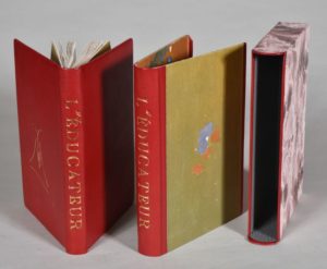DE VOULONGES. L'ÉDUCATEUR. PARIS, AUX DÉPENS D'UN GROUPE DE BIBLIOPHILES, 1948. Un volume, grand in-8, pleine reliure en chagrin rouge. Dos lisse portant le titre doré en long, tête dorée, couverture conservée, non rogné. Chemise à rabat, plats habillés de vert amande, dos identique au dos du volume. Illustré de 26 planches libres gravées par l'artiste et tirées en taille - douce, eaux-fortes en couleurs comprises dans la pagination.