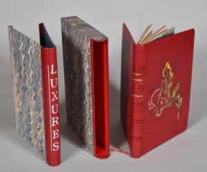DEKOBRA Maurice. LUXURES. PARIS, ÉDITIONS DU LOUP, 1928. Un volume, petit in-4, pleine reliure en peau chagrinée rouge. Dos à 5 nerfs portant le titre doré, décor érotique en couleurs sur le premier plat, en noir sur le second plat. Non rogné, tête dorée, couverture conservée, chemise à rabats dans la même peau chagrinée rouge habillée sur les plats de papier à la cuve, titre à la chinoise en blanc sur le dos, étui bordure peau. Édition originale avec les illustrations en couleurs érotiques de Claude Remusat.