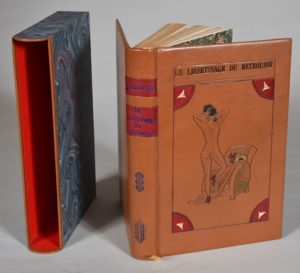 DONVILLE G. LE LIBERTINAGE DU RETROUSSÉ. PARIS, AUX GALANTS PASSE - TEMPS, 1937. Un volume, grand in-8, pleine reliure en basane fauve. Dos lisse décoré et portant deux pièces de basane rouge pour le titre, décor érotique personnalisé au trait et en couleurs sur le premier plat, tête dorée, couverture et dos conservés, étui bordures peau. Bel état. Ouvrage orné de 16 héliogravures libres.