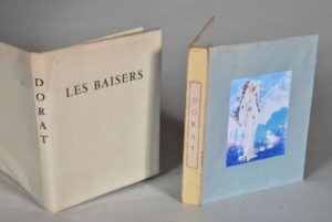 DORAT. LES BAISERS. Précédés du moi de mai poème. Réimpression textuelle sur l'édition originale de 1770. EDDIS, 1947, s. l. Un volume, in-8, en feuilles sous chemise rempliée et chemise cartonnée illustrée. Dos uniformément passé Compositions originales érotiques en couleurs de Brunelleschi.