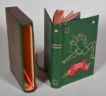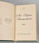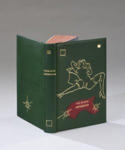 E. D. [Émile DESJARDIN]. MES ÉTAPES AMOUREUSES. IMPRIMÉ POUR LES COLPORTEURS GASCONS, s. d. (Paris, Marcel Seheur,1935). Un volume, in-8, pleine reliure en peau granité verte. Dos lisse portant le titre doré, le premier plat est occupé par le titre doré sur une pièce de basane rouge et par un dessin personnalisé érotique au trait doré, tête rouge, étui bordures peau. Illustré, en couleurs, de six gravures libres.