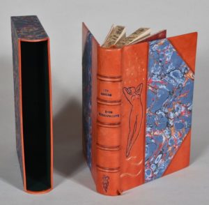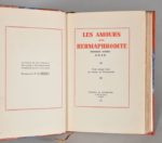 [FONTANGES Serge de ]. LES AMOURS D'UN HERMAPHRODITE. Mémoires intimes de M. de B. Texte intégral réuni par Serge de Fontanges. PARIS, ÉDITIONS DU COUVRE-FEU, 1935. Un volume, in-8, de 237 pp., (1) f., demi-reliure à coins en basane rouge. Dos à 5 nerfs portant le titre gravé à froid. Premier plat illustré d'un motif personnalisé gravé à froid entouré de filets courbes et d'étoiles dorés. Tête dorée illustrée de motifs érotiques, couverture et dos conservés. Étui bordé de peau. Tirage numéroté limité à 500 exemplaires.