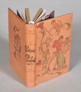 [GRAND - CARTERET John]. IMAGES ET POÉSIES GALANTES. Étrennes récréatives à la mode d'autrefois pour maintenir les Honnêtes Dames en joyeuse humeur durant les 365 jours de l'Année Commune. PARIS, A LA LIBRAIRIE ALBIN MICHEL, s. d. Un volume, in-12, pleine reliure en basane beige. Dos à 4 nerfs portant le titre calligraphié en noir, les plats sont entièrement recouverts d'une illustration personnalisée en plusieurs couleurs, tête dorée, couverture conservée, deux planches collées sur les contre - plats. Illustrations en noir hors - texte.