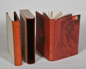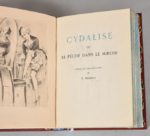 [GROS Johannes]. CYDALISE ou le péché dans le miroir. s. l., s. n., s. d. (Dijon, Imprimerie Darantière, vers 1930). Un volume, in-8, pleine reliure en chagrin roux. Dos lisse décoré et portant le titre en rouge à la chinoise, premier plat illustré un décor personnalisé à froid et trois fleurs en rouge, jaune et noir. Grande fleur mosaïquée en rouge et vert sur le second plat. Guirlande florale en vert et or intérieure, chemise à rabat au dos identique à celui du volume, étui bordures peau. Illustré de huit eaux-fortes de T. Martens.