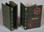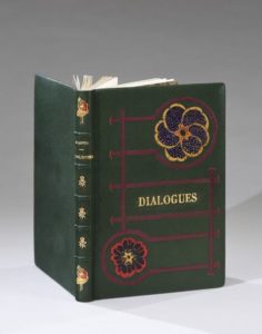 LOUS Pierre. DOUZE DOUZAINS DE DIALOGUES ou petites scènes amoureuses. s. l., s. n., 1903. (Paris, vers 1935). Un volume, grand in-8, pleine reliure en peau maroquinée bronze. Dos à 5 nerfs décoré de motifs en rouge et or et portant le titre doré. Important décor floral et géométrique mosaïqué sur le premier plat, tête dorée. Chemise cartonnée à revers, dos décoré et doré, étui bordures peau. 12 gravures très libres à pleine page finement rehaussées au pochoir, non signées, attribuées à André Collot.