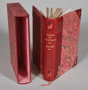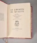MIRABEAU. LE LIBERTIN DE QUALITÉ. Nouvelle édition accompagnée d'une notice bibliographique par Helpey bibliographe poitevin. ALENÇON, CHEZ JEAN-ZACHARIE MALASSIS, 1929. Un volume, in-8, demi-reliure à coins en maroquin rouge sombre. Dos lisse décoré à froid de deux fleurs mosaïquées et portant le titre doré, décor à froid et doré sur la peau des plats, feuilles non coupées, étui bordures peau. Ouvrage orné de 20 eaux-fortes libres, non signées et d'un hors-texte rehaussé à l'aquarelle.