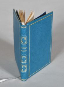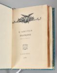 [NOGARET François Félix]. L'ARÉTIN FRANÇOIS PAR UN MEMBRE DE L'ACADÉMIE DES DAMES. A LONDRES, 1787. (Éditions de la Plume, 1953 ?). Un volume, in-12,pleine reliure en peau maroquinée bleue. Dos à 5 nerfs décoré et doré portant le titre doré, filet doré d'encadrement sur les plats, roulette dorée sur les coupes, tête dorée, couverture et dos conservés. Illustré par 18 figures libres coloriées.