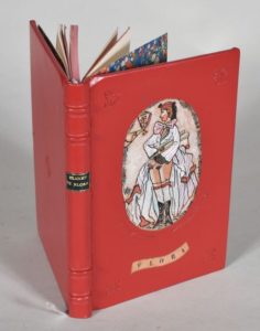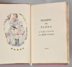 [PROTAT Louis]. EXAMEN DE FLORA à l'effet d'obtenir son diplôme de putain. PARIS, s. n., s. d. (vers1935). Un volume, in-8, pleine reliure en basane rouge. Dos à 4 nerfs portant une pièce de titre en basane brune, large dessin érotique en couleurs inséré sur le premier plat, motifs à froid dans les angles, couverture conservée. Il comporte 14 illustrations coloriées au pochoir par Feodor Rojanovski, dit Rojan, dont un frontispice.