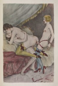 ROSEMONT Gladys de. INITIATIONS VOLUPTUEUSES. A L'ALCOVE DE VÉNUS. Un volume, in-8, demi-reliure à coins en chagrin cerise. Dos à 5 nerfs décoré et doré portant deux pièces de basane sombre pour le titre doré, tête bleue, couverture conservée. Étui bordures peau. Illustré de 10 planches très libres, en couleurs, hors texte.