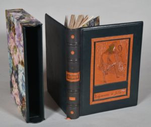[SAINTE CROIX de]. LES ÉGAREMENTS DE JULIE. Texte collationné d'après l'édition princeps de 1756, revu sur l'édition de 1782. L'orthographe, l'accentuation et la ponctuation ont été intégralement reproduites. PARIS, MLM, 1949. Un volume, in-4, pleine reliure en basane noire. Dos à 4 nerfs portant le titre sur plusieurs pièces de basane fauve. Illustration très libre sur le premier plat gravée sur une large pièce de basane fauve encastrée dans un cadre décoré à froid, couverture conservée, étui bordures peau. Illustré d'aquarelles originales par de Sainte Croix.