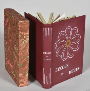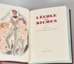 [SCHEM]. L'ÉCOLE DES BICHES. Ou moeurs des petites dames de ce temps. s. l., s. n., 1939. Un volume, in-8, pleine reliure en chagrin bordeaux. Dos lisse décoré et portant le titre en blanc, titre reporté sur le premier plat accompagné d'un large décor, tête dorée, tranches jaspées de bleu, couverture conservée, étui bordures peau. Illustrations libres, en couleurs, attribuées à Schem.