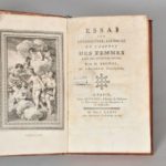 THOMAS de l'Académie Françoise. ESSAI SUR LE CARACTÈRE, LES MOEURS ET L'ESPRIT DES FEMMES DANS LES DIFFÉRENTS SIÈCLES. PARIS, MOUTARD, 1772. Un volume, in-8, de frontispice gravé, (2) ff., 210 pp., (1) f., pleine reliure de l'époque en veau havane. Dos lisse orné et doré portant une pièce de titre en basane verte, triple filet d'encadrement sur les plats, filet doré sur les coupes, tranches rouges. Usures du temps, curieuse étiquette sur la page de titre portant l'inscription "Scripta manent", la même au verso, deux marges inférieures ont été découpées sans atteinte au texte. Bon exemplaire peu courant.