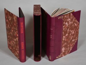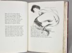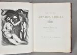 VERLAINE Paul. OEUVRES LIBRES. AMIES - FEMMES - HOMBRES. Suivies du Sonnet du Trou du Cul par Paul Verlaine et Arthur Rimbaud. AUX DÉPENS DES AMIS DU CALLIBISTRIS (vers 1950). Un volume, in-4, demi-reliure à coins en chagrin bordeaux. Dos à 5 nerfs se continuant au trait sur les plats et portant le titre doré. Décor doré sur le premier plat, tête décorée du titre calligraphié en rouge, non rogné. Chemise, dos et revers en peau bordeaux, étui bordures peau. Illustré de lithographies originales en couleurs dont les hors textes sont rehaussés à la main par l'artiste.